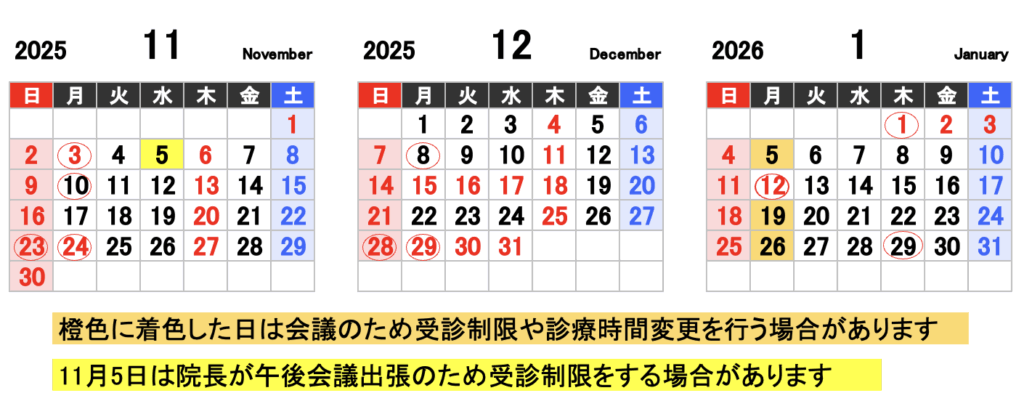祝祭日・年末年始・お盆は休診です。学会出席などのため臨時休診がございます。